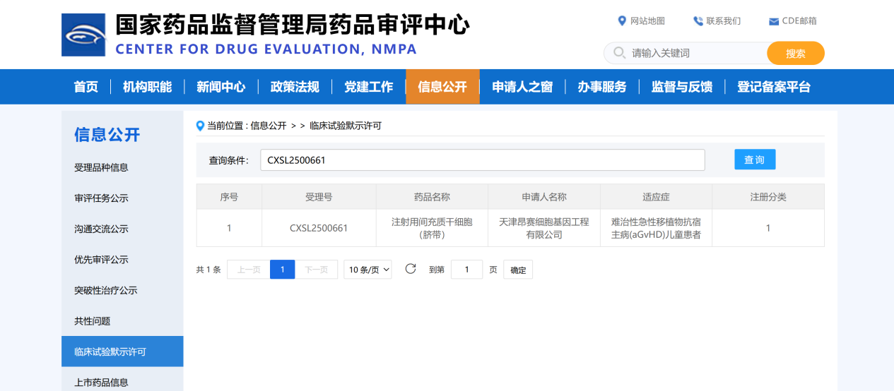 2025年11月3日, 天津昂賽細胞基因工程有限公司申報的注射用間充質干細胞(臍帶)治療難治性急性移植物抗宿主?。╝GvHD)兒童患者的適應癥獲得國家藥品監(jiān)督管理局臨床試驗默示許可